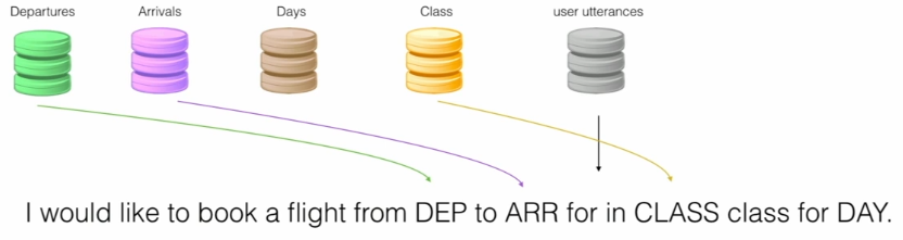 User utterances 데이터베이스에서 위와 같은 사용자 발언을 가져오자. 그리고 나서 우리는 나머지 각 데이터 셋에서 슬롯을 무작위로 플러그인 할 수 있다. 이것은 수십 또는 수백가지의 다른 조합을 만들어 자동으로 데이터 셋트와 레이블을 증가시키는 한가지 방법이다. 예를 들어보면 utterance가 10개 Departure가 5개, Arrivals가 3개, Days가 20개, Class가 2개 있다면 10x5x3x20x2개의 조합을 만들 수 있다.