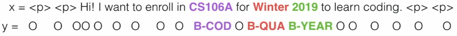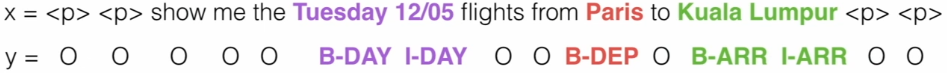 데이터 측면에서는 이전의 것과 비슷해 보일 수 있다. 하지만 우리는 Seq2Seq문제를 가지게 된다. 여기서 사용자들의 발언의 단어들은 순서가 있고 슬롯 태그 또한 순서있을 것이다.