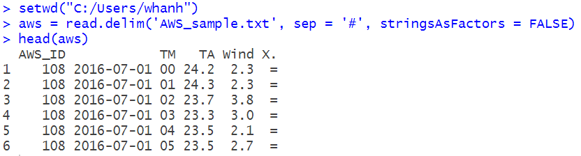 | > aws = read.delim('AWS_sample.txt', sep = '#', stringsAsFactors = FALSE) > head(aws) AWS_ID TM TA Wind X. 1 108 2016-07-01 00 24.2 2.3 = 2 108 2016-07-01 01 24.3 2.3 = 3 108 2016-07-01 02 23.7 3.8 = 4 108 2016-07-01 03 23.3 3.0 = 5 108 2016-07-01 04 23.5 2.1 = 6 108 2016-07-01 05 23.5 2.7 = |