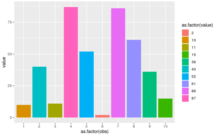 | > ggplot(data=bar_df, aes(x = as.factor(obs), + y = value, + fill = as.factor(value)))+ + geom_bar(stat = 'identity') |