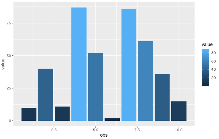 | > ggplot(data = bar_df, aes(x = obs, + y = value, + fill = value))+ + geom_bar(stat = 'identity') |
