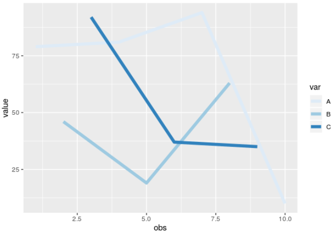 | ggplot(data = color_df, aes(x = obs, y = value, group = var, color = var)) + geom_line(size = 2) + scale_color_grey(start = 0.2, end = 0.8) |