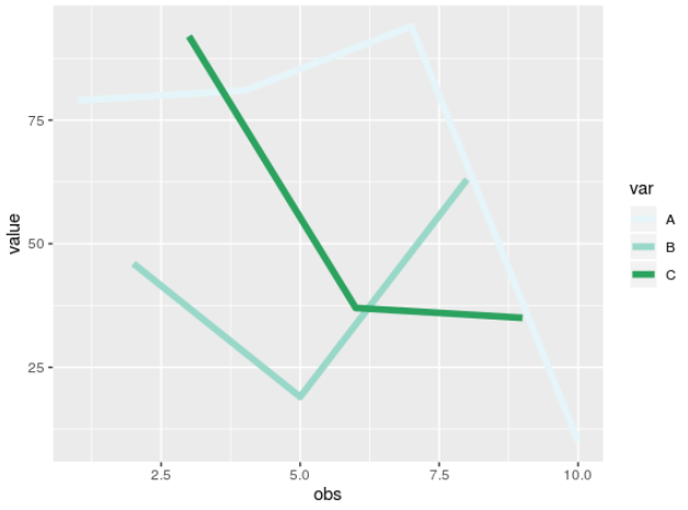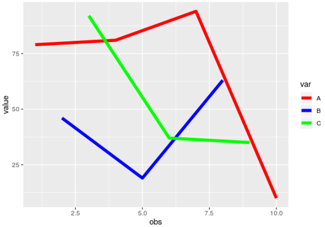 | ggplot(data = color_df, aes(x = obs, y = value, group = var, color = var)) + geom_line(size = 2) + scale_color_manual(values = c('A'='red', 'B'='blue', 'C'='green')) |