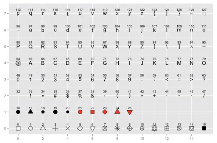| ggplot(data = bar_df, aes(x=obs, y=value, color=value, shape=var))+ geom_point(size=10)+ scale_shape_manual(values = c('A'=7, 'B'=8, 'C'=9)) |