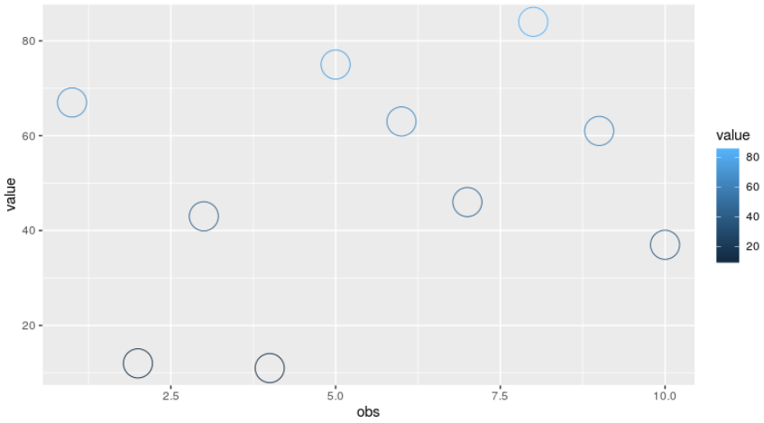 | ggplot(data = bar_df, aes(x=obs, y=value, color=value))+ geom_point(size=10, shape = 1) |