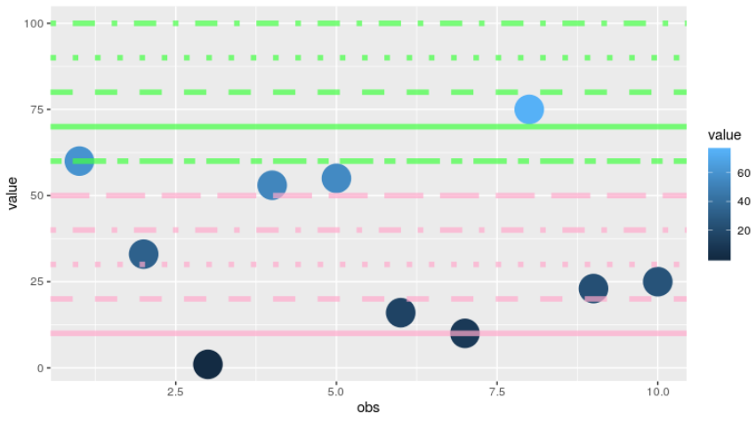 | ggplot(data = bar_df, aes(x = obs, y = value, color = value))+ geom_point(size = 10)+ geom_hline(yintercept = 10, size = 2, color = '#FFAACC', alpha = 0.7, linetype = 1) + geom_hline(yintercept = 20, size = 2, color = '#FFAACC', alpha = 0.7, linetype = 2) + geom_hline(yintercept = 30, size = 2, color = '#FFAACC', alpha = 0.7, linetype = 3) + geom_hline(yintercept = 40, size = 2, color = '#FFAACC', alpha = 0.7, linetype = 4) + geom_hline(yintercept = 50, size = 2, color = '#FFAACC', alpha = 0.7, linetype = 5) + geom_hline(yintercept = 60, size = 2, color = '#44FF44', alpha = 0.7, linetype = 6) + geom_hline(yintercept = 70, size = 2, color = '#44FF44', alpha = 0.7, linetype = 7) + geom_hline(yintercept = 80, size = 2, color = '#44FF44', alpha = 0.7, linetype = 8) + geom_hline(yintercept = 90, size = 2, color = '#44FF44', alpha = 0.7, linetype = 9) + geom_hline(yintercept = 100, size = 2, color = '#44FF44', alpha = 0.7, linetype = 10) |