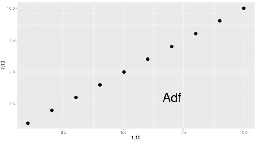 | ggplot() + geom_point(aes(x = 1: 10, y = 1:10), size = 3) + annotate(geom = 'text', label = 'Adf', size = 10, x = 7, y = 3) |