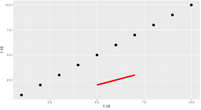 | ggplot() + geom_point(aes(x = 1:10, y = 1:10), size = 3) + annotate(geom = 'segment', color = '#FF0000', size = 2, x = 5, xend = 7, y = 2, yend = 3) |
