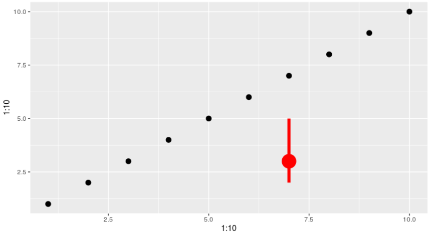 | ggplot() + geom_point(aes(x = 1:10, y = 1:10), size = 3) + annotate(geom = 'pointrange', color = '#FF0000', size = 2, x = 7, y = 3, ymin = 2, ymax = 5) |