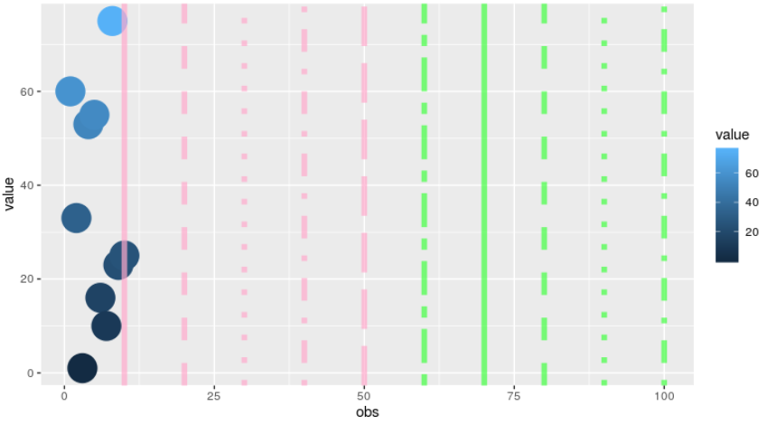 | ggplot(data = bar_df, aes(x = obs, y = value, color = value))+ geom_point(size = 10)+ geom_vline(xintercept = 10, size = 2, color = '#FFAACC', alpha = 0.7, linetype = 1) + geom_vline(xintercept = 20, size = 2, color = '#FFAACC', alpha = 0.7, linetype = 2) + geom_vline(xintercept = 30, size = 2, color = '#FFAACC', alpha = 0.7, linetype = 3) + geom_vline(xintercept = 40, size = 2, color = '#FFAACC', alpha = 0.7, linetype = 4) + geom_vline(xintercept = 50, size = 2, color = '#FFAACC', alpha = 0.7, linetype = 5) + geom_vline(xintercept = 60, size = 2, color = '#44FF44', alpha = 0.7, linetype = 6) + geom_vline(xintercept = 70, size = 2, color = '#44FF44', alpha = 0.7, linetype = 7) + geom_vline(xintercept = 80, size = 2, color = '#44FF44', alpha = 0.7, linetype = 8) + geom_vline(xintercept = 90, size = 2, color = '#44FF44', alpha = 0.7, linetype = 9) + geom_vline(xintercept = 100, size = 2, color = '#44FF44', alpha = 0.7, linetype = 10) |