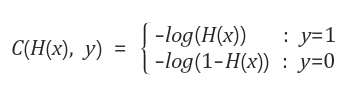 만약 실제 y=1이라면 H(x)가 1로 예측했다면 비용 C(H(x),y)=0이 나오지만 H(x)가 0으로 예측했다면 비용은 무한대가 된다.
